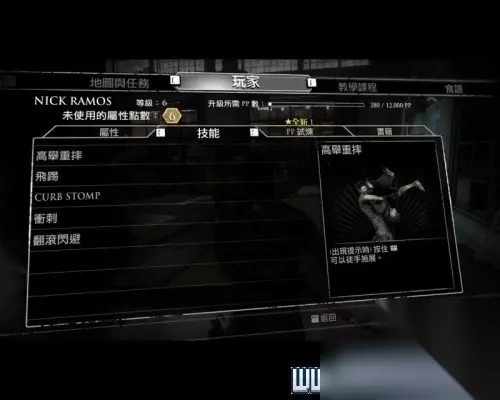技能详解(即出招列表) 抽取内脏(disembowel):按住Y键 B键和下拉左摇杆,抽取丧尸的大肠。 扭头功(head job):按住Y键 B键和左推左摇杆,扭断丧尸的脖子。 倒竖冲(body slam):按住Y键 B键,抱住丧尸然后倒竖冲撞在地板上。 丧尸投掷(zombie toss):按住Y键 B键和上推左摇杆,抓住丧尸将其掷出。 斧头回旋(hammer spin):按住Y键 B键和右推左摇杆,抓住丧尸回旋一周然后将其掷出。 飞踹(jump kick):在空中按X键,施展出飞腿。 飞膝(knee drop):在空中按Y键,施展出飞膝。 肩冲(shoulder charge):奔跑时按X键,施展出肩冲。 上勾拳(chin check):连续点击X、X、X键,施展出上勾拳。 失控乱揍(wrecking ball):连续点击X、X、X、X键,施展出失控乱揍。 回旋腿(wheel kick):连续点击Y、Y键,施展出回旋腿。 侧踢(side kick):连续点击Y、Y、Y键,施展出侧踢。 践踏(curb stomp):按住Y键,施展出践踏。 奔跑(sprint):按住LB键,就可以奔跑一段距离。 翻滚(dodge roll):摁下左摇杆,就可以翻滚躲避丧尸的攻击。