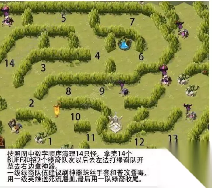丛林秘境是1个很特别的副本,这里面的话是有神器存在的,但是不会是辣么就简单得到,要用特定的方法才行,别担心接下来小编就教大家剑与远征丛林秘境怎么拿神器。 根据图上的大数字次序从1打到14,随后会话左下方的箱子,箱子成为的怪用五个绿裔打。如此是能完美的打过。 假如是想先早早拿神器的玩家们,可以先不要管箱子和左上方的大怪。只需把15按次序打过,以后随便打别的怪,藤蔓都不会长上,就能一路直接奔着神器过去。剩下的可以留着等之后级别高了,抑或绿裔多了再清,说到底最关键的是得到神器。