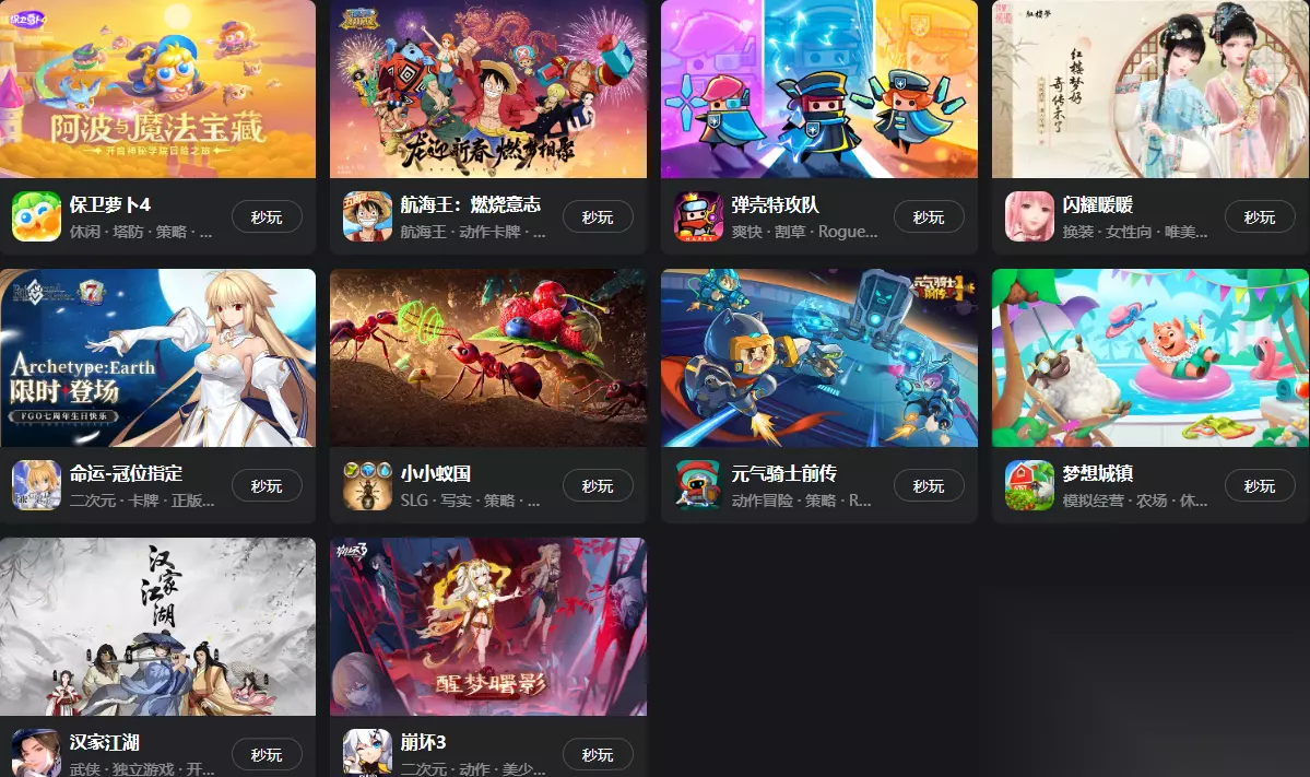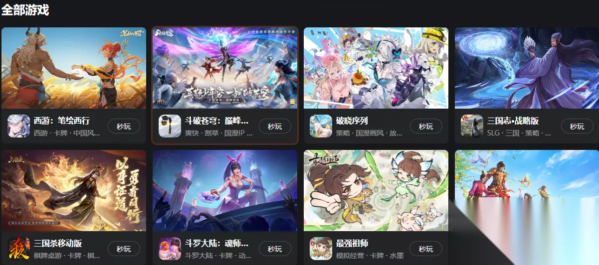 另外就是在233乐园平台当里,游戏数量和类型都是十分丰富的,数量繁多的游戏都是可以畅玩的,还有很多时下非常火爆的游戏均是可以体验的,比如大家比较喜欢的《三国志·战略版》,《西游:笔绘西行》,《斗罗大陆:魂师对决》,《问道》,《三国杀移动版》,《最强祖师》,《斗破苍穹:巅峰对决》等等游戏都是点开即玩的。