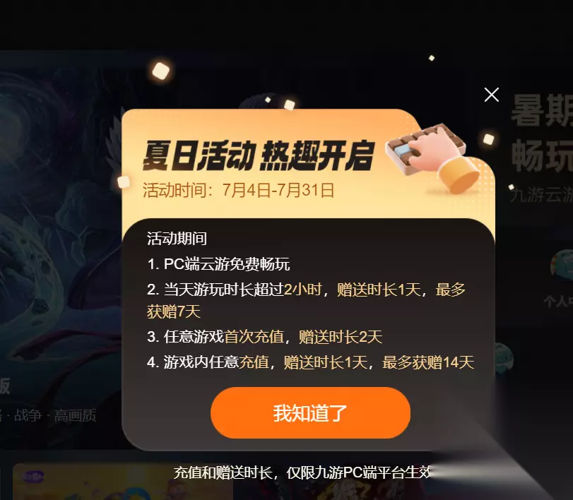 在活动期间,PC端的云游戏都是免费畅玩的,而且游玩时间超过2小时,还会赠送一天畅玩时长,累积可获得七天;首充也有赠送2天时长的福利,本次活动福利多多,不容错过。