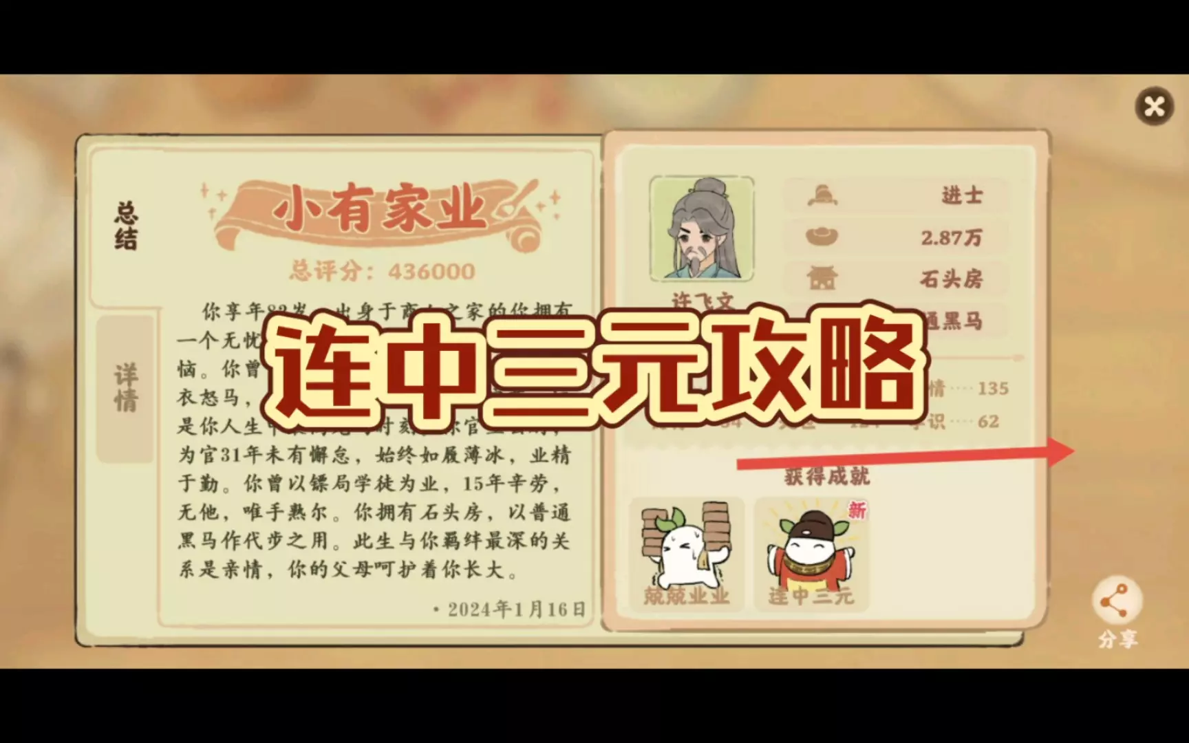 身世: 最佳身世肯定还是官宦之家( 不是官官也是可以的 ) 天赋:天赋图2这四个影响比较大,特别是前两个。其中身残志坚要故意生病不治疗,掉到体魄20以下就会触发。 事件: 事件加的学识也不可忽视,最佳选项和避雷选项都列了。 官职:目前只有会试之后的县尉、太史和主簿可以。其中主簿最容易。 从以上四个方面来降低它的难度。加油哦!多试一两次就可以啦。