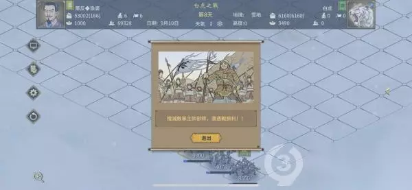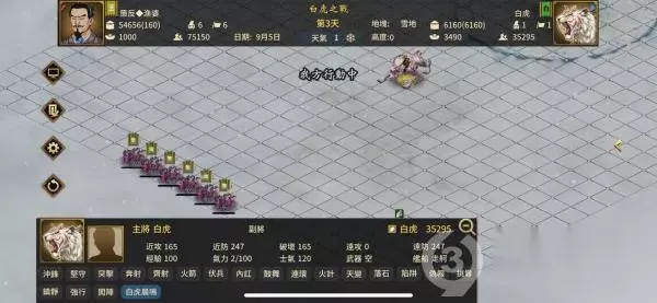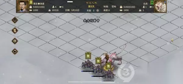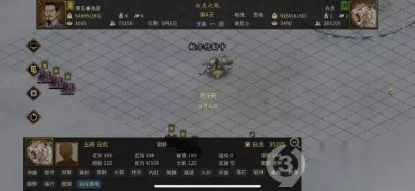 开局上来直接6发倾国倾城,这时等待白虎释放第一个技能(白虎晨啸),该技能减血恐惧减气力,这时白虎的血量已经降至5W血以下了。这时可以把武将往两边移动,这样可以减少损兵,兵力充足也可以原地挨几下。