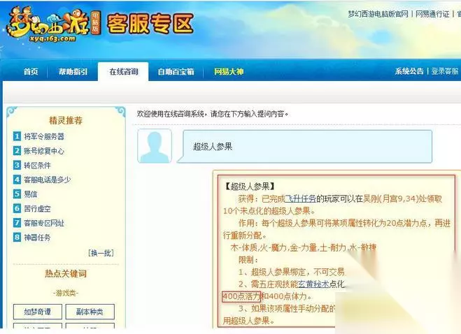 点化前需确认活力与体力充足 点化前的准备工作 确保角色已完成五级观技技能和黄秘术学习。 活力和体力均达到400点以上。 若属性手动分配点数不足20,可补足后再使用超级人参果。 注意:点化后才能正常使用超级人参果,未达条件无法点化。 超级人参果的获取途径 已完成飞升任务的玩家可前往吴刚(月宫9,34)领取10个未点化的超级人参果。