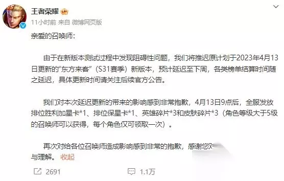 王者荣耀s31赛季什么时候开始 延期时间: 由于在新版本测试过程中发现阻碍性问题,我们将推迟原计划于2023年4月13日更新的“东方来客”(S31赛季)新版本,预计延迟至下周,各类榜单结算时间随之延迟,具体更新时间请关注后续官方公告。 王者荣耀公告 我们对本次延迟更新的带来的影响感到非常抱歉,4月13日9点后,全服发放 排位胜利加星卡*1、排位保星卡*1、英雄碎片*3和皮肤碎片*3(角色等级大于5级的召唤师可以获得,每个角色仅可领取一次)。 再次对给各位召唤师造成影响感到非常的抱歉,感谢您对王者荣耀的支持与理解。 根据此前官方公布的消息,这次新赛季照旧会带来新英雄以及其他内容的更新。 其中,新英雄稷下武道学院-姬小满将上线。据官方介绍,“混世魔王”姬小满金币价格为13888金币,点券价格为588点券(首周388点券,次周488点券)。当然,除使用点券或金币购买外,新英雄还可以通过英雄试玩和英雄赛季故事系统获得,或者通过英雄碎片商店中以58英雄碎片进行兑换。姬小满的动态表情“专心摸鱼”和“全军出姬”也将同步上线。 王者荣耀新赛季的荣耀战令也将更新,会提供更多新皮肤。