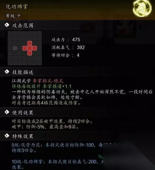 特殊作用:5级作用-阴魂不散:运用本招式时对方针形成1~2层本作用,每层使进犯-15,每回合主动叠加1层,最高叠加10层。 绝技:化功绵掌 调配幻阴掌,一个降攻,一个减防,我愿称其为武侠界的急支糖浆,越阶战役毫无压力。