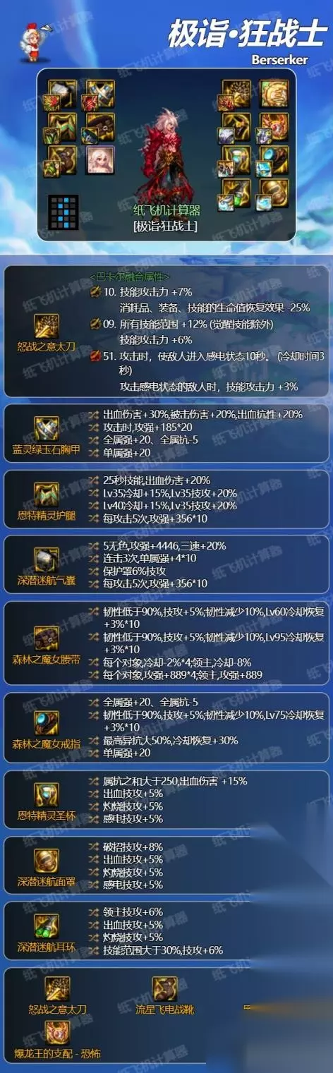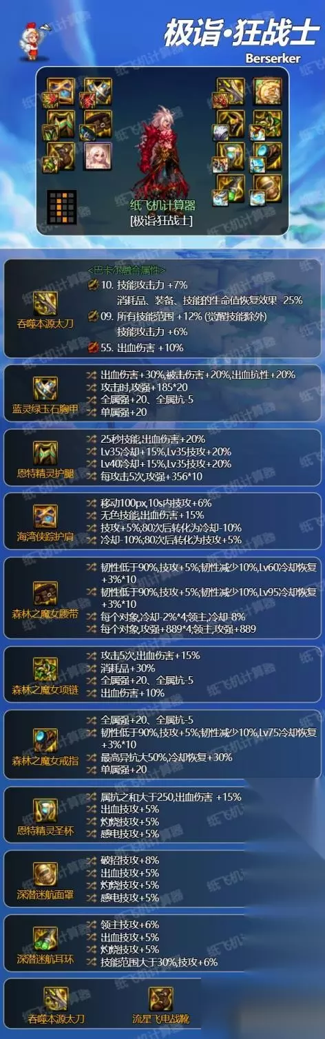 DNF狂战士装备怎么搭配 一、入门装备搭配 当前版本固定史诗装备获取难度较低,可先使用如下装备进行入门搭配。 武器考虑: 狂龙武器,需要配合范围词条触发属性,根据搭配穿戴。 邪龙武器,触发异常属性,身上异常词条大于等于3种不同可带。 冰龙武器,提供冰属性攻击等,不推荐。 CP武器,红眼专属提升太小,不推荐。 制式武器,百搭属性,首选。 觉醒武器,红眼觉醒占比一般,次选武器。 贴膜武器属性选择: 词条1:范围技攻,全流派均可用技能。(首选) 词条2:查漏补缺属性,如无法出发身上自定义属性5技攻,选择攻击时,使敌人进入感电/中毒状态10秒,攻击感电/中毒敌人是,技能攻击力+5%,如果能触发就选择一个7技攻,负面状态少可以接受的。 词条3:出血流选出血10%,非出血流选触发异常状态的。 【方案一】无自定义出血散搭流 搭配说明:传统出血流搭配,平民首选,伤害中规中矩,鞋子腰带也可换攻速鞋+火抗腰走攻速出血流。