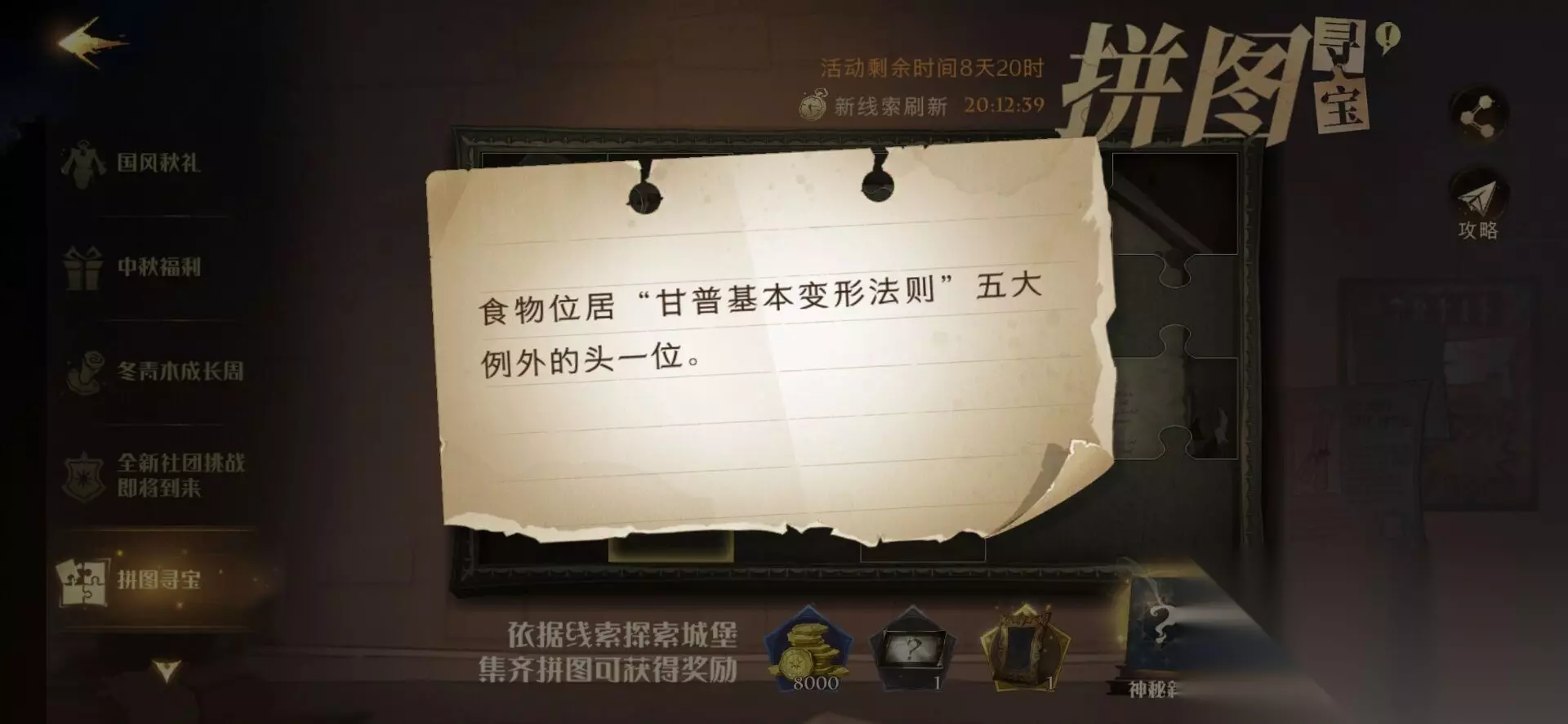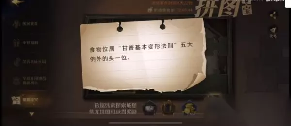 具体流程: 1、从地图上直接去往霍格沃茨礼堂; 2、进来后往里面走,来到卡珊德拉旁边,点击桌子上的小奶酪; 3、这里将奶酪变成一只老鼠,就可以获得第二块拼图; 哈利波特魔法觉醒拼图寻宝927的拼图任务已经开启,“食物位居甘普基本变形法则五大例外的头一位”是今天的线索,很多玩家不知道这个线索提示的位置在哪里,可多参考上面的攻略了解这块拼图的位置哦。