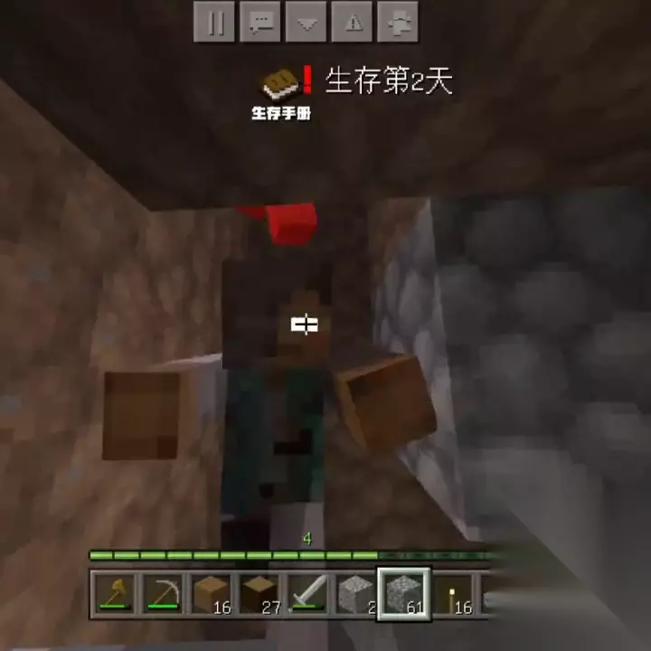 这里改成半台阶,因为有趴着的怪物,避免进入。同时,在等待的过程中,还可以挖矿消磨时间,说不定会有惊喜。我制作了一个很长的木棍,没见过,是木制大盾牌。原来这只是一个原版的盾牌,可以防御用。为了加快吸引怪物掉落,我决定在这里也开一个出口。按剧本走?不按剧本走怎么了?其实这一切都是宝儿节目的效果而已。