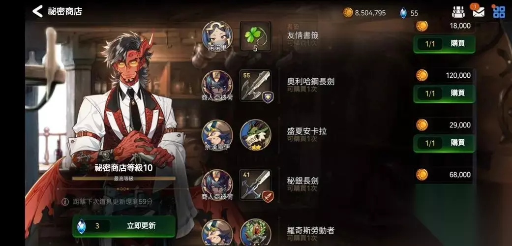 2、战令买一次后即可永动肯定是必买的,下面主要聊聊刷商店是什么意思 3、推主线解锁主界面酒馆里的商店后,可以用3个钻石刷新一次,这个商店是能出书签和神秘的(0氪神秘主要来源),100个钻石基本能刷出一到两次书签,刷到神秘书签就更赚,运气不好100钻石刷个寂寞,但是总体比直接换书签要划算的多的多的多 4、建议是用脚本刷,毕竟钻石一周平均能就能攒40000-5000左右,手刷商店会死人的 5、最后友情提醒:钻石是刷商店没错,但是刷出来的东西是要用金币买的,而这游戏金币是巨缺的,所以刷商店量力而行,在e7没金币可是寸步难行的,不过我感觉开服应该会出免装和buff活动,到时候趁机多刷点钱吧