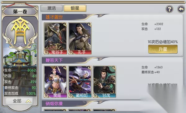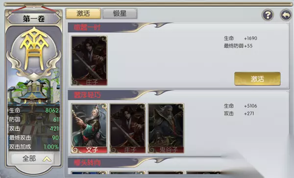 那么获得名将卡有什么用呢?在等级达到165级英雄谱功能开启后,默认解锁第一卷,之后角色每升30级解锁新一卷。 各位将军请先看下英雄谱激活页面的布局: