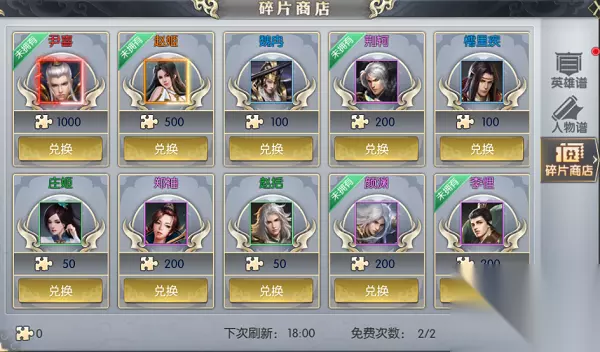 碎片商店每日8、12、18点都会自动刷新一次,每次自动刷新后都会增加2次免费刷新次数。 碎片商店的道具可以通过消耗卡牌碎片兑换道具,每个道具数量为1,兑换后在当前时间段不能再次兑换,未有的卡牌右上角有未拥有标识,已购买的卡牌右上角有售完的标识。