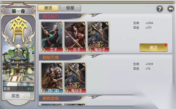 激活页面当前拥有的卡牌会以亮色显示,没有拥有的卡牌会以灰色覆盖,集齐某种羁绊后的全部卡牌后,即可点击激活按钮激活该羁绊,获得大量属性加成!