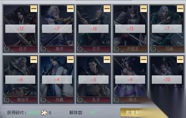 但是如果碰到卡牌非常多,且不是同一张卡牌的情况该怎么办呢?那么就有一个非常实用的功能在等你了,点击右下角的批量解体按钮后即可点选任意卡牌,选好需要批量解体的卡牌后再次点击批量解体即可一次性解体选中的所有卡牌。(选中的卡牌默认解体最大数量,可以点击卡牌右上角的减号按钮减少解体数量)