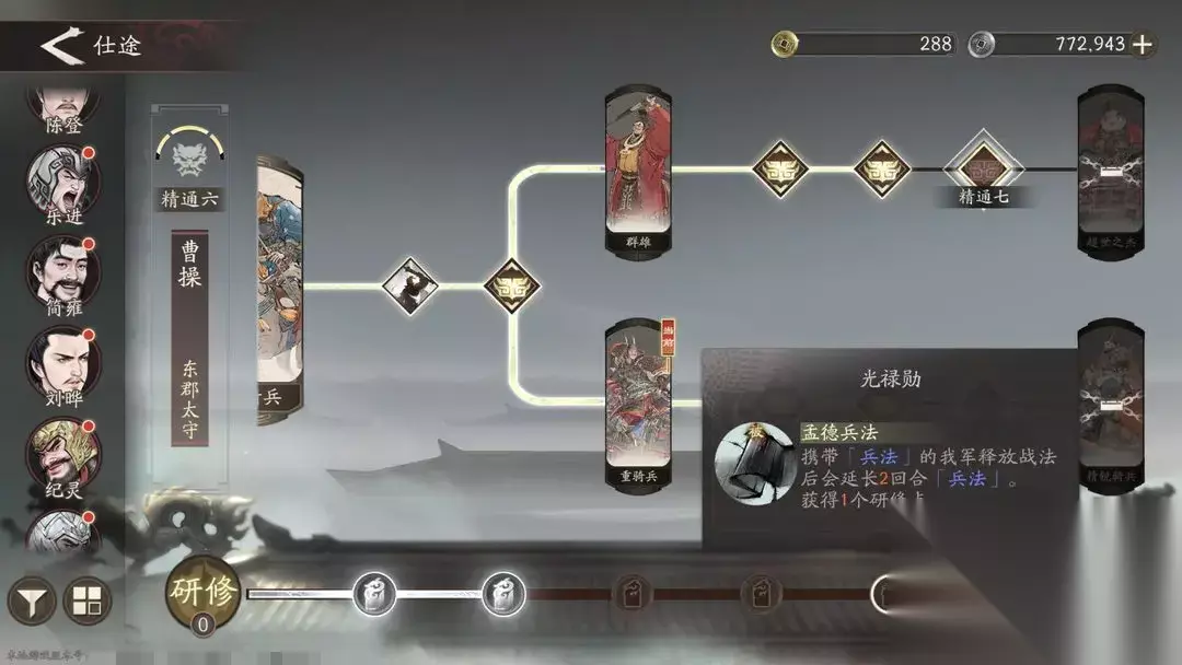 比较推荐的技能有“突进”,能将敌方从一些较为有利的地形,比如关隘,祭坛,营帐等段还见内无法拔除,但是有需要占领的地形,用这个招式就能直接将对手推出去。”横刀跃马”对敌造成130%伤害,升级后添加“虚弱”、“易伤”效果,用来点杀敌方将领非常合适。”雪恨”这个技能也不用多说,二阶后能回血,大幅度的提升他战斗生存效果。