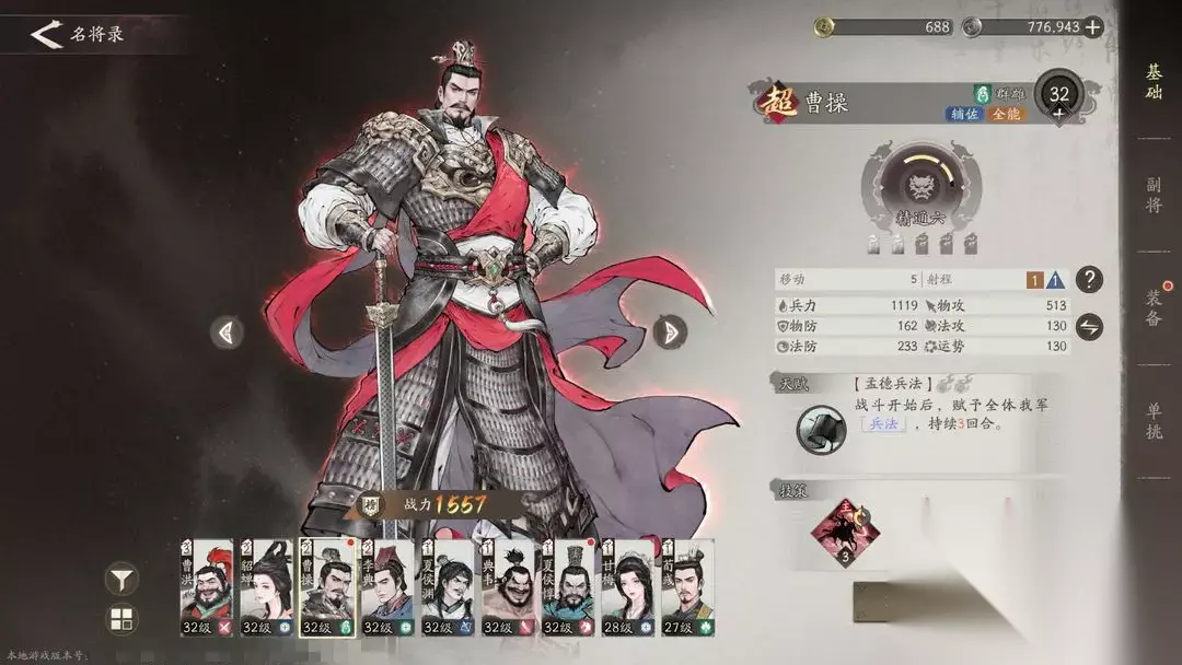 1、曹操曹操是开局就拥有的主角,具有超强的辅助能力,能给整个队伍都带来超多增益效果,还有相当不错的输出能力,可作为辅助和副C使用,能力十分全面,作为超品武将,培养起来也比较简单,是个就业率很好,从初期一直可以用到后期的武将。他也是目前唯一拥有光环技能的武将,他的强大是不言而喻的。天赋效果在战斗初始时,给全体友方附加“兵法”,升迁到满阶,施放的战法直接延长几个回合,让物攻,法攻,物防,法防均提高15%,虽然无法叠加,但是不可驱散,是非常强力,且全面的增益buff。