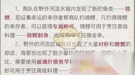 明日之后锦鲤位置 锦鲤是淡水鱼,在野外河流中可以垂钓获得。使用三级鱼竿有更大的概率,推荐大家去【秋日森林】地图上垂钓,这是一种全新的鱼种,在概率上相对来说要低一点,所以钓鱼的时候一定要有耐心。 在鱼饵的选择上可以使用普通的鱼饵,如果有更高级的鱼饵也可以尝试使用,这样兴许可以增加大家钓上来的概率节省时间。 锦鲤作用介绍 使用锦鲤可以制作高级料理锦鲤刺身,跟之前的鱼儿相比,这个料理很明显更加高级,而且可以兑换金条,是不是又发现了一个全新的生财之道呢。 目前12月13日的更新中已经添加进来了这个全新鱼种,有兴趣的小伙伴赶快去垂钓吧。