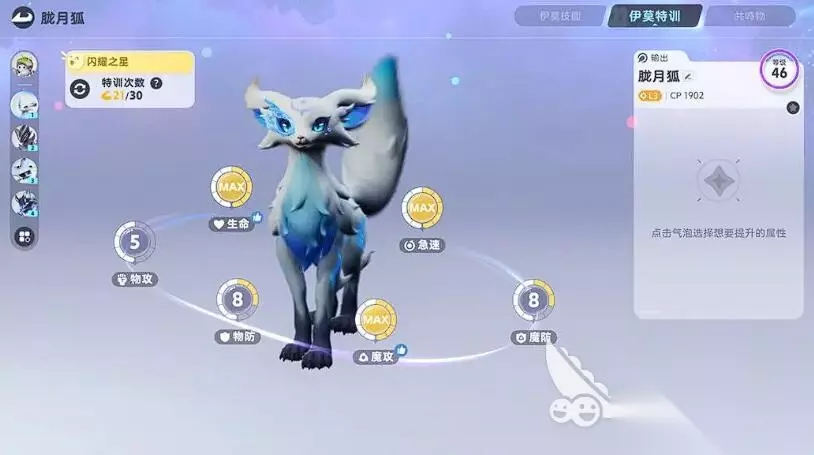 输出型推荐胧月狐,属于开荒主力输出手,开局邮件直接领取,无需捕捉。个体值五项全满,无需反复刷属性。18级时前往朝花村完成“狐影之谜”任务(限时5分钟内击败3波蓬蓬羊),进化后解锁“月华冲击”——长按技能键蓄力1.5秒,对直线10米内敌人造成光属性爆发伤害,面对草系BOSS花舞兰时,贴身绕至其背部(避开正面藤蔓攻击),连续释放两次蓄力月华冲击可直接破除其护盾,经验果优先喂给它,确保首日升至18级进化。技能升级顺序:月华冲击>普攻>闪避。