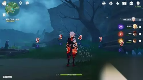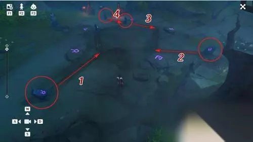 按照上面的顺序,也就是下图中标号顺序从1至5依次点亮(普通攻击即可点亮),就会再次出现伊部的幻影,自动进入对话。