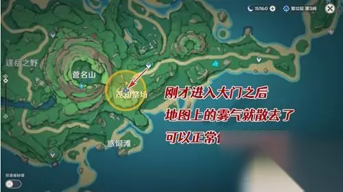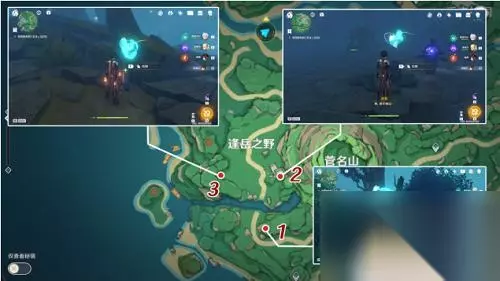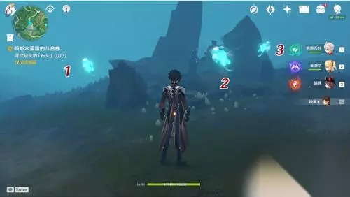 重复上述步骤,将三个仙灵对应的三个石头都找回来并开启即可。每个仙灵到达的终点(即石块所在位置)如下图所示: 注:在迷雾中做任务注意携带雷元素角色,及时点亮附近的雷石,以防迷失在浓雾中