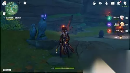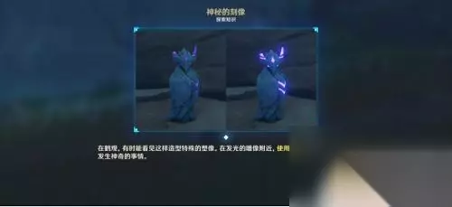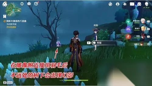 4、前往目的地,使用「羽毛」 装备上羽毛后,跟随阿瑠到附近的雷鸟雕像,这时会弹出关于羽毛的教程,原来,我们昨天没法交互的发光雕像,是需要用这个道具照一下才可以(类似于2.0版本的留念镜和地狐雕像)