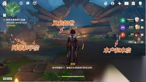 8、听听当地人的对话(共3处) 之前变得空无一人的祭场,今天又有人在了,我们和他们对话看看吧。 需要对话的NPC共3组,分别是木户和木奈,阿部和宇奈,又和知世。其中,前两组NPC在第一次对话结束后,再次对话,会有不一样的内容,对剧情感兴趣。