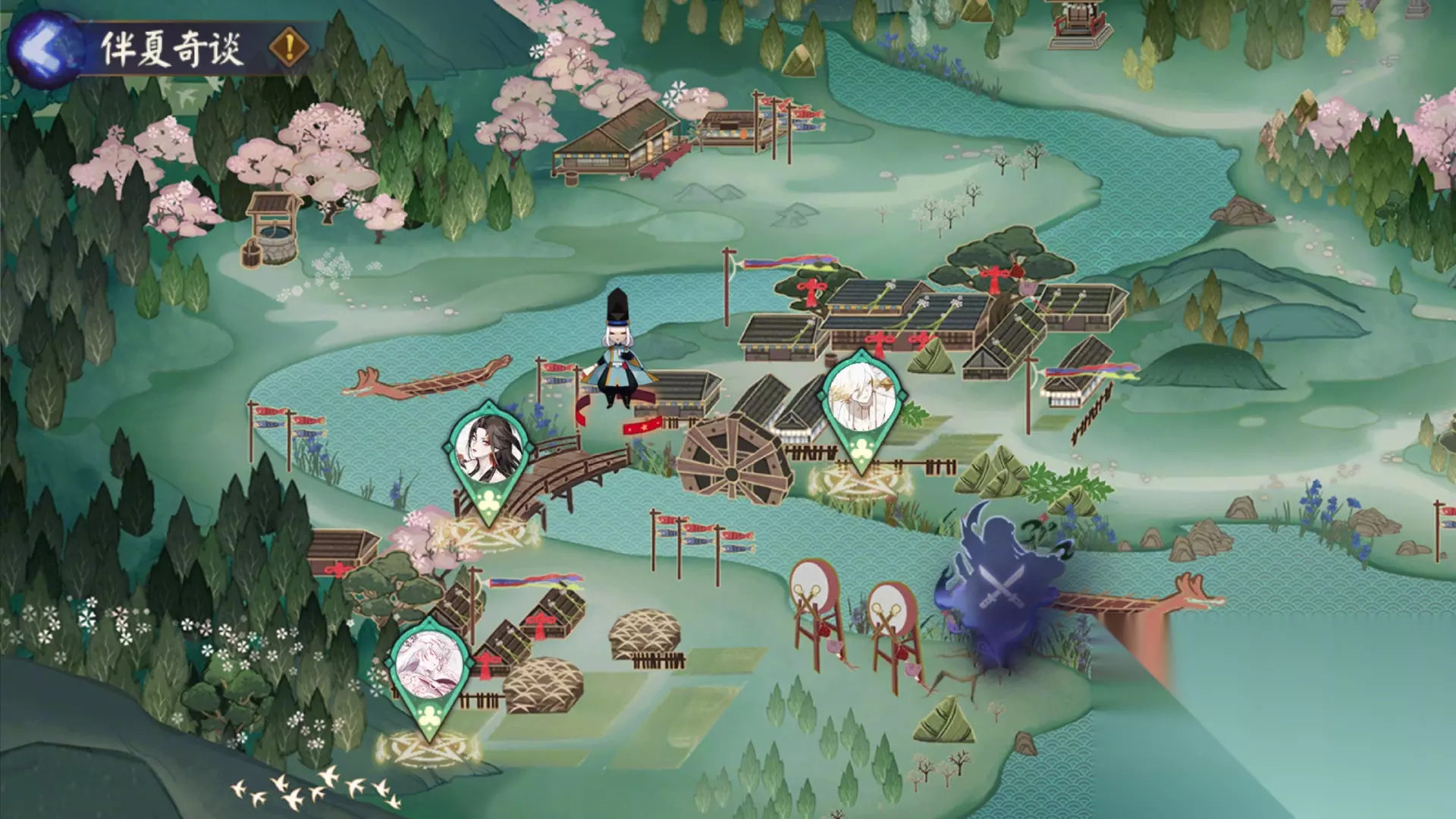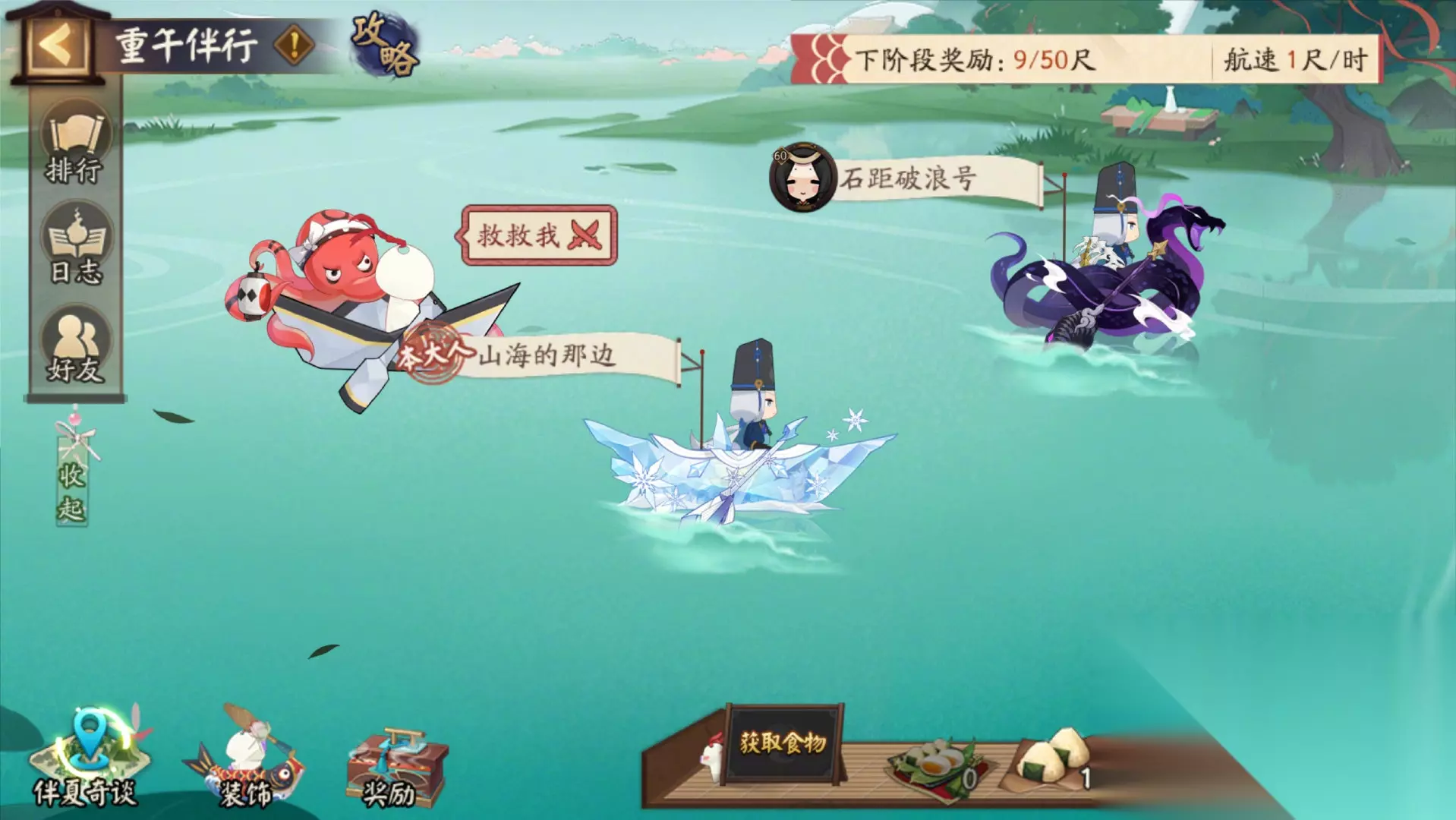 ※活动期间,大人可通过完成花合战任务,或参与「伴夏奇谈」和「消暑合战」玩法获取「糯心食盒」,食用不同的食物可让小船增加不同的航行距离。 ※大人在航行中还有可能获得其他阴阳师大人的助推,及有几率遇到「奇遇」。还可在「装饰」界面中,为自己的小船解锁随机装饰,每解锁1个装饰将可增加触发奇遇的几率并获得1个初阳茅卷。 ※伴夏奇谈:「萤火溪流」中每天0点将刷新战斗、材料、答题3种任务,完成即可获得糯心食盒等奖励。
