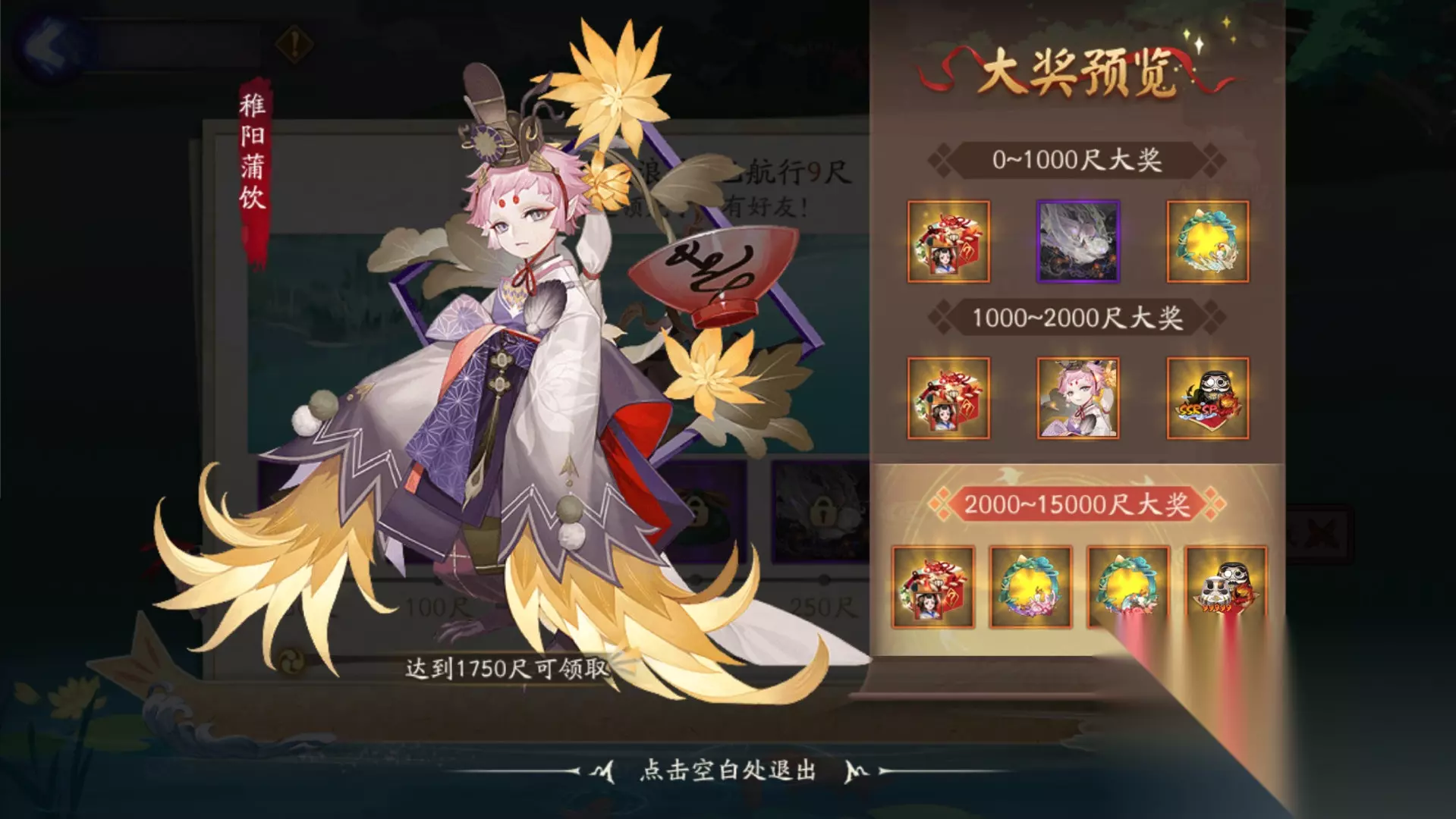 活动奖励: 随着大人的小船航行距离增加,每50尺可解锁1档对应奖励,将可获得神秘的符咒、限定插画·醉甜乡、动态头像框祥午重舟·辉月、祥午重舟·繁时、祥午重舟·舞焰(获取动态头像框祥午重舟·舞焰的同时,还将获得限定聊天气泡框·祥午细雨)、童男新皮肤·稚阳蒲饮、伴夏礼包、樱间宝匣等丰富奖励。
