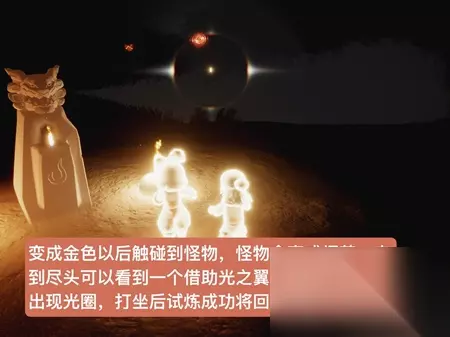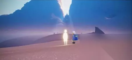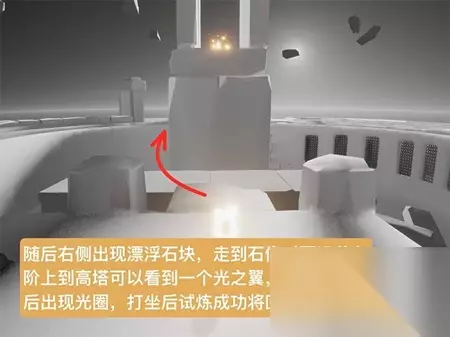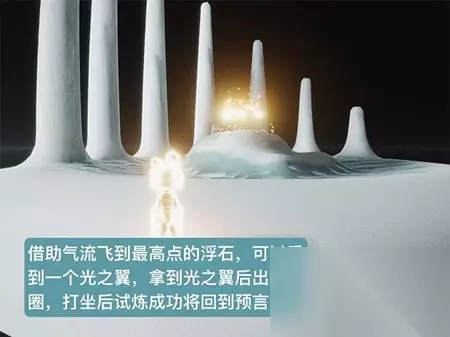 祭祀结束后,它耗尽了光翼。你会看到一个小漂亮的男孩独自悲伤,走过去,和他牵手,拉他起来,然后点击他,拥抱他。他会帮你一臂之力,让你恢复到七翼。然后你会一直朝光束飞,向上飞。之后,你会在白屏上跑一段距离,然后飞向星空。在路上,你会看到许多飞翔的祖先与他们相撞,他们可能会得到烛光。然后你会去结算升华蜡烛的地方。向前走,会有一个换衣服的地方。在那里,你可以用升华蜡烛解锁祖先永久光的翅膀。你可以在出去的时候得到它们。否则,你可以在重生后解锁它们,等待下一个牺牲。去光门重生后,不要急着跳过动画。十几二十秒钟后,你可以听到得到一个小金人的声音。这时,你可以跳过,否则就没有小金人提前跳过。