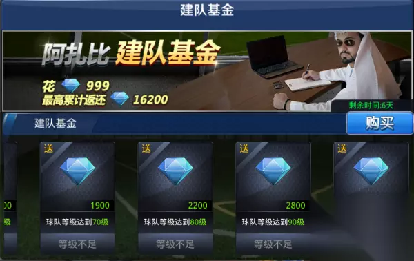 2、及时购买阿扎比建队基金。花费999钻石购买阿扎比建队基金可以在后面的相应等级领取钻石,最高可以领16200钻石。