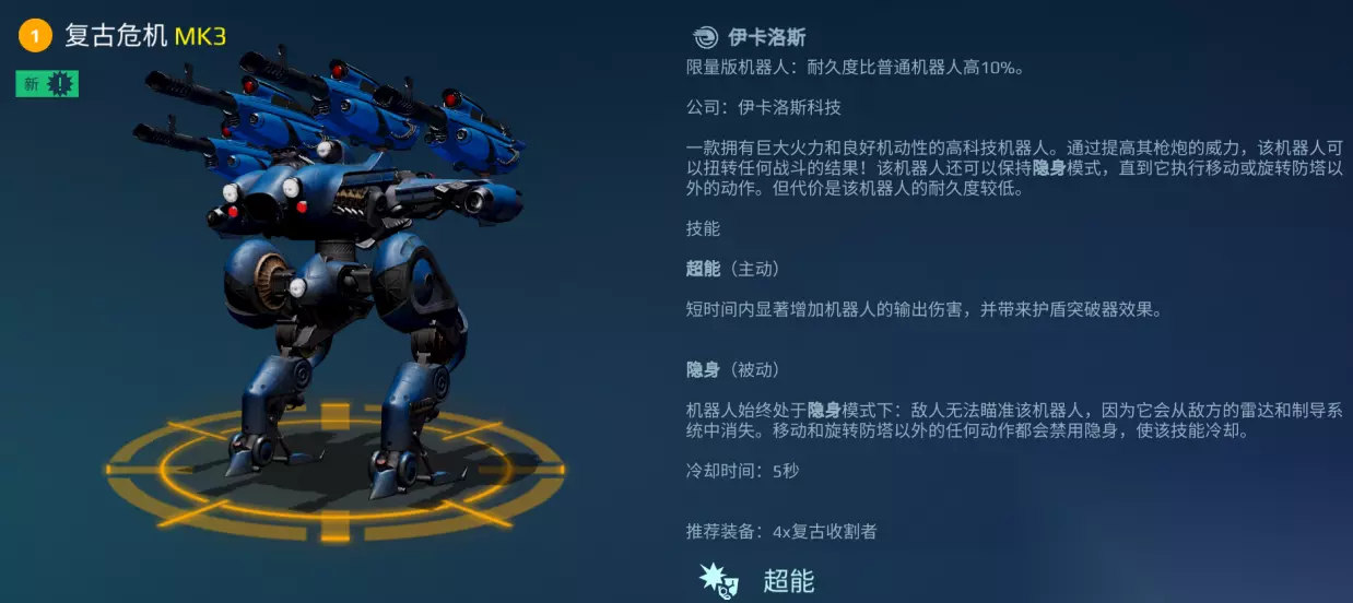 锁定无效,先发制人!一些机器人凭借着超凡的隐形科技,能神不知鬼不觉地穿梭于枪林弹雨之间,在敌人还未反应过来之时,便给予致命一击,彻底扭转战局。本周小坦为各位指挥官带来那些高人气隐身机甲的盘点内容! 对于承担着抢塔占点或迅速完成收割任务的机甲而言,“隐身”无疑是一项极为出色的能力,其在一定程度上可使机甲处于无敌状态。 以热门机甲“复古危机”为例,其隐身状态-无法被选中的特性使其能够在掩体后从容寻找目标,并掌握开火的主动权。在适当的时机,它可以在安全距离内,通过解除隐身状态并发射超高的爆发伤害,重创对手。