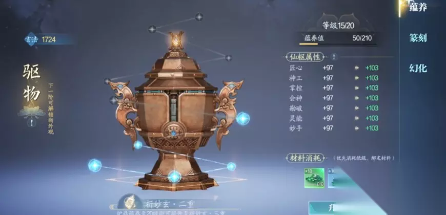 在法宝的选择上,由于天音对攻防血属性有较高需求,噬血珠成为了必选之物,即便玩家通过其他途径获取了部分攻防血属性装备,但考虑到铸元系统以及法宝收集任务的要求,所有法宝最终都需要解锁,因此无需额外花费大量金钱去购买攻防血类法宝,直接利用任务赠送的25个碎片合成噬血珠即可,这样既经济又高效,除了噬血珠之外,其他法宝也有相应的推荐搭配,比如大梵流派可使用天琊,万象流派适配大悲金轮,无量流派则宜选用紫金葫芦。
