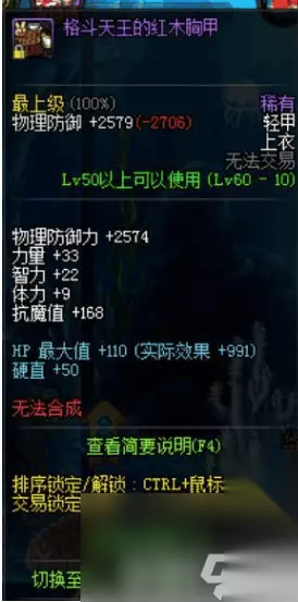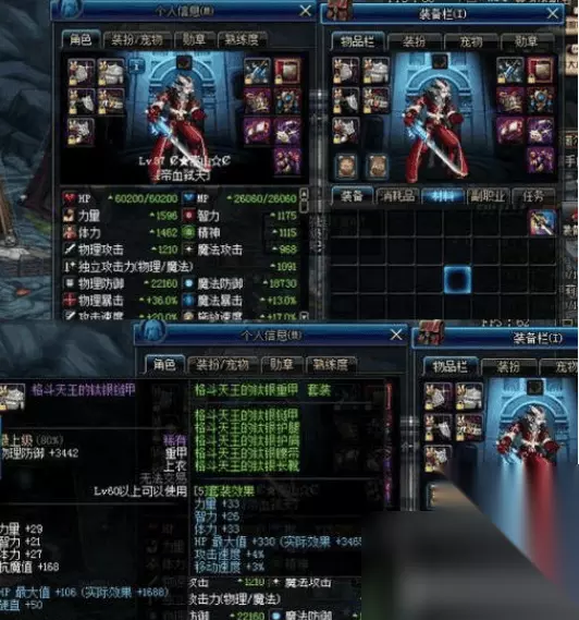 绝版格斗天王套介绍: 在红眼的身上还有一套格斗天王重甲套,回归的一个老号,格斗天王胜点套还保留着,并没有删除,而手上的是青环蛇太刀,都是很久远的装备。格斗天王重甲装备是60级的,五件重甲,所以属性是五套效果,虽然在90版本这套装属性不值得一提。但是,在当时格斗天王套单件加血量和硬直,套装也加血量,还加移速和攻速,在决斗场中,格斗天王套还是很强势的。