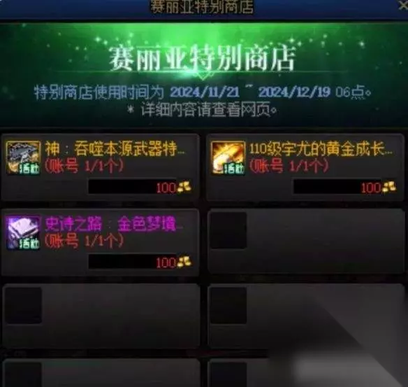 dnf嘉年华回归怎么玩 1、赛丽亚商店 升满级后先在赛丽亚商店把【Robin的特别见面礼】等道具全部买了,每个只要100金币;
