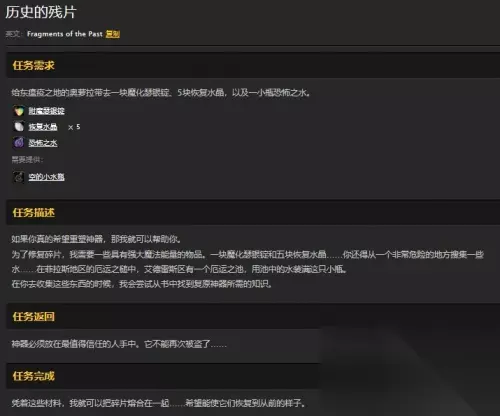 在魔兽世界怀旧服中,历史的残片第二步任务要求玩家找到一些具有强大力量的魔法物品,包括一块附魔瑟银锭、五块恢复水晶和一瓶恐怖之水。这些物品的获取 *** 各有不同,需要玩家进行探索和收集。其中,恢复水晶需要在安戈洛环形山北部水晶塔处合成,而恐怖之水则需要在厄运之槌西区的艾雷德斯营地里面找到水池,并使用空瓶灌满。这些任务物品的获取过程虽然有一定的难度,但完成任务后,玩家将获得丰厚的奖励和成就感。 任务接取地点 玩家可以在东瘟疫之地北部的奥萝拉处接取到历史的残片第二步任务。 具体坐标如下: