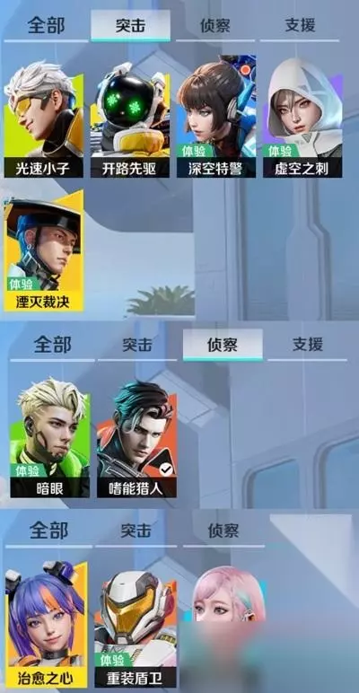 上图就是10个英雄根据技能的职业分配,我个人是推荐2突击1侦查1支援。 其中侦查必备,虽然其他英雄的被动也可以感知到周围的敌人,但毕竟是被动不是主动,不能主动触发,并且当我们周围人多混战的时候,被动的感知往往不如两个主动技能的侦查英雄好用。 例如猎人就能在开启大招后持续报点对面,而暗眼的机器人也能对附近的敌人逐一探测。 而突击主要就是对敌人进行追击或者包绕,一般建议是选2个,这样子当我们去其他队友被击杀,我们可以快速去召回队友。当然也可以不选,就和队友抱团即可。不过一般不建议,有一个突击英雄的话能快速支援正在交火的队友,并且还能快速进圈。 而支援方面,一般最少都要选一个,能保证在己方劣势或者交火位置不好的时候,可以利用这三个英雄的技能进行打状态,转移,缓冲。支援中的三个角色,除了奶妈是偏向辅助的,剩下的重装和电磁是偏向防御的。