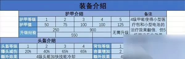 上表就是三大件的详情介绍,其中护甲是可以通过攻击敌人,开物资箱和吃护甲经验获取。 从1级到2级护甲需要250经验,2到3级需要550,3到4级需要900建议。5级甲只能通过捡去,不能通过升级获取。 攻击敌人的伤害是和获取的护甲经验相等,我们攻击敌人50点伤害就能获取50点护甲经验,开物资箱固定获取10建议,吃护甲经验就是75点。所以获取护甲经验最快的就是攻击敌人,也就是说,我们在开局可以多杀人机以此来提高我们的护甲等级。 虽然5级甲有125点护甲,但4甲有一个治疗翻倍的效果,也就是说,我们没必要强求获取5甲。例如我们只是远程打狙的话,我个人觉得4甲就最好,100点护甲敌人不可能秒杀我们,我们还能快速打满状态对敌人进行反击。5甲反而适合突脸,和敌人正面交火的玩家。 而头盔和背包只有4个等级,是不能通过升级经验获取高等级的头盔和背包,只能通过捡,选择就是有高等级就拿高等级的。毕竟4头可以加快技能领取,4包可以加快拉队友的速度。