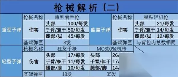 上表是关于手枪和轻机枪的测试。 个人不建议选择手枪,但这审判者手枪的伤害确实高,怪不得叫“审判者”。不过很容易马枪,所以也不建议使用,而狂怒手枪一般就是在娱乐模式中的“枪王之战”中可以用到,其中有一个回合就是只能用这两把手枪。不过在经典模式不建议用。 轻机枪方面个人建议选择星粒轻机枪,虽然伤害方面比不上MG600,但是子弹方面绝对比得上,因为星粒的子弹是根据枪械持续开枪来决定的。如下图花圈的地方。
