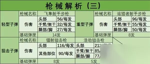 上表是关于狙击枪和射手步枪的测试结果表。 射手步枪和狙击枪我们要玩的话带一把就行了,个人建议直接带狙击枪,比较狙击枪的射击距离会更远,并且伤害更高。 射手步枪里面如果硬要选一把,那就是追猎者了,毕竟伤害高了差不多2倍,虽然飞隼者的子弹飞比追猎者多一些,但射手步枪大部分还是用来远处连狙敌人,争取在少量子弹的情况下击杀敌人。 而狙击枪里面我建议选择浩劫狙击枪,不单单是因为浩劫的伤害高了镭射一倍,还在于镭射的射击方式是一条射线,如果想要打满116点伤害,那么久必须一发射线都要打中才行,一般敌人不呆都不会让你打满伤害的。其次我们看上去好像镭射的子弹会多,但实际上镭射攻击一次消耗两个子弹,也就是说浩劫的子弹反而会多一个。
