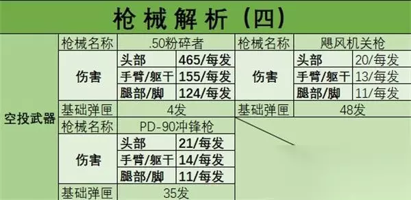 上表就是空投里面的武器,只有在空投才能捡到的,而且捡到就是满配的武器。 飓风冲锋枪在刚刚射击时射速会慢一些,但随长按射速就会上去,满配件的加成会让这把枪使用起来顺畅。.50粉碎者狙击枪基本上打头一枪一个,管敌人有没有头都是一枪一个。而冲锋枪就是子弹多,伤害也高,最重要的是配件全,使用起来比其他的基础武器要好。这三把枪压枪都比较容易,就算距离超远,压枪相比起其他枪都会容易许多。这点在飓风机关枪和另外两边机关枪上面会有更加明显的对比。 四、游戏实战 本板块是全文的核心板块,不过实战主要是根据作者个人对游戏的理解来就行解说,所以会与各位玩家有所区别。当然对于没有玩过或者是不会玩的玩家,我相信这一板块的游戏思路还是能对你有所帮助的。 6、地图解析 我们先从地图方面解析一下这张经典模式的地图物资分布情况,以便后面规划打法思路,毕竟“磨刀不误砍柴工”嘛。