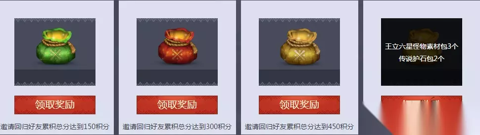 注意事项 1、等级40级以上的玩家可邀请9月27日前连续7天及以上未登录的好友回归游戏; 2、被邀请的好友需要在右侧“邀请记录”里面选择接受邀请,才算邀请成功; 3、可以邀请多个好友回归,个人邀请回归好友累积总分是所有回归好友的总积分之和; 4、只要您邀请的回归好友在本页面上活动2的积分总和达到了指定分数,即可领取积分奖励。 看了上文233乐园小编带来的《怪物猎人OL》国庆狂欢祭 海量好礼大放送,你是否了解了相关内容信息,知道了呢!更多最新最好玩的手机游戏就来233乐园下载吧! 如转载涉及版权等问题,请作者与我司联系,我司将在第一时间删除或支付稿酬。