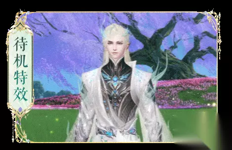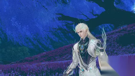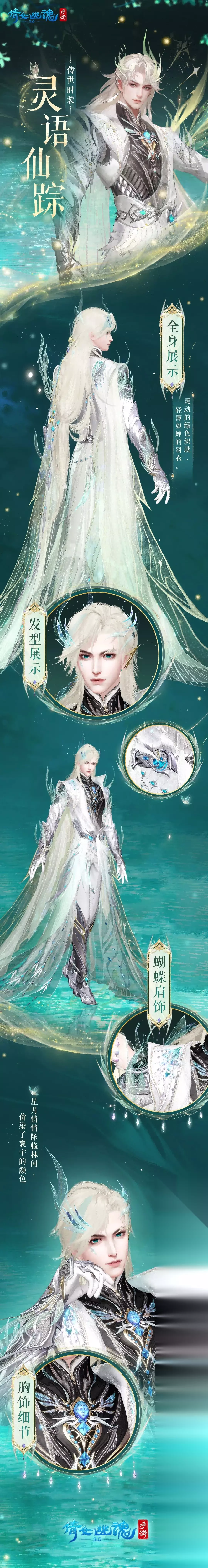 成女款在细节上也极尽奢华,宝石链条点缀全身,腰部前后均有蝴蝶状鎏金装饰,背后珍珠纹饰若隐若现,就连头饰也皆由纯金打造。 成男款 成男款整体为黑白色修身款式,搭配银色铠甲,金色长发松散地系在身后,精致优雅。标志性的轻纱织羽衣由肩部垂至地面,行走间羽衣随风飘动,仙气四溢。