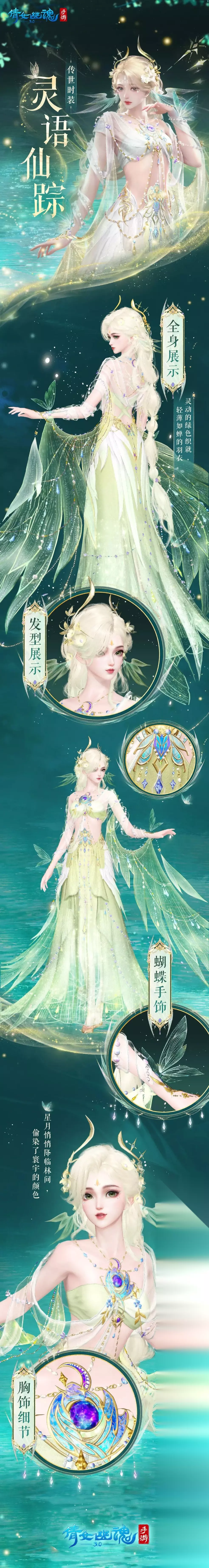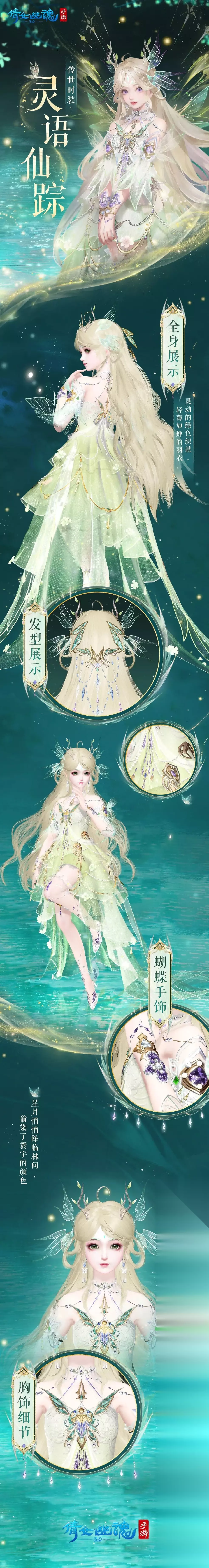 成女款 绿色长裙搭配金色微卷长发,成女款仿佛从森林中走来的精灵女王,全身充满了“羽翼”元素:薄如蝉翼的轻纱羽衣,如蝴蝶献吻般的手饰,长裙侧面缝制白色羽毛装饰,就连星空宝石胸饰也做成了羽翼环月的形状。