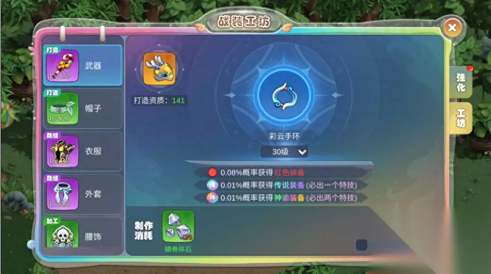 再就是关于宠物的装备啊,游戏中装备是靠玩家自己收集材料打造的,可以获得绿,紫,橙,红,传,神品质的装备,前面说到宠物是可以提升打造红品的概率的,传说和神谕只是额外附加了1/2个装备特技。打造材料可以通过野怪掉落或者商店购买。