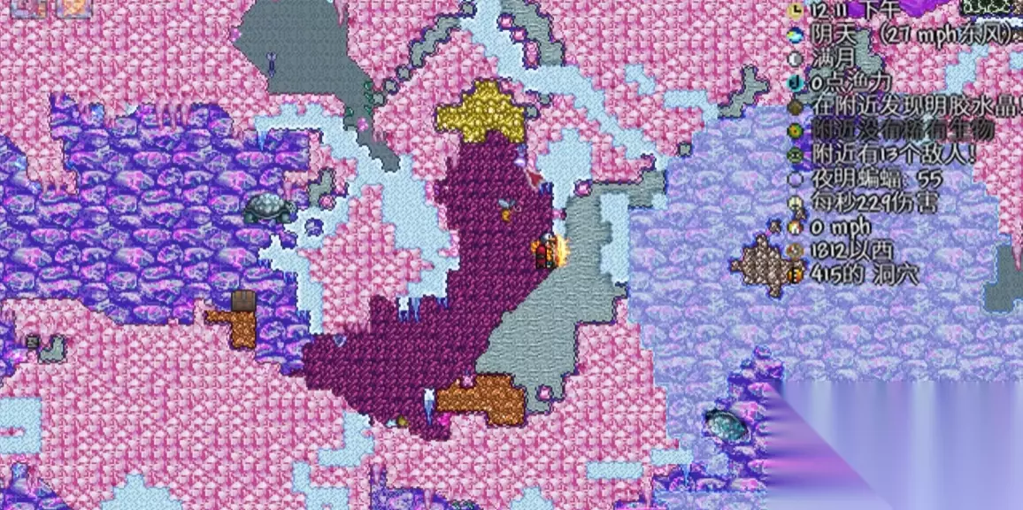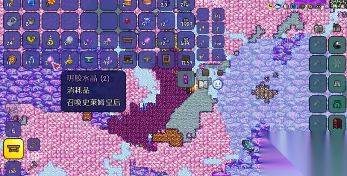 寻找过程中,玩家需要携带足够的照明工具和挖掘装备。由于神圣之地地下环境复杂,建议准备钩爪、羽落药水等辅助道具以便探索。明胶水晶会嵌在石头表面,使用任意镐类工具开采即可获取。在2517以西、1103洞穴坐标附近区域是较常见的生成位置之一,但这并非绝对坐标,仍需玩家仔细探索整个神圣之地地下区域。