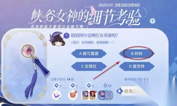 猜猜图中是哪位女英雄呢?(提示:生而耀眼,我很抱歉~) A.娜可露露 B.阿珂 C.安琪拉 D.夏洛特 正确答案:B.阿珂