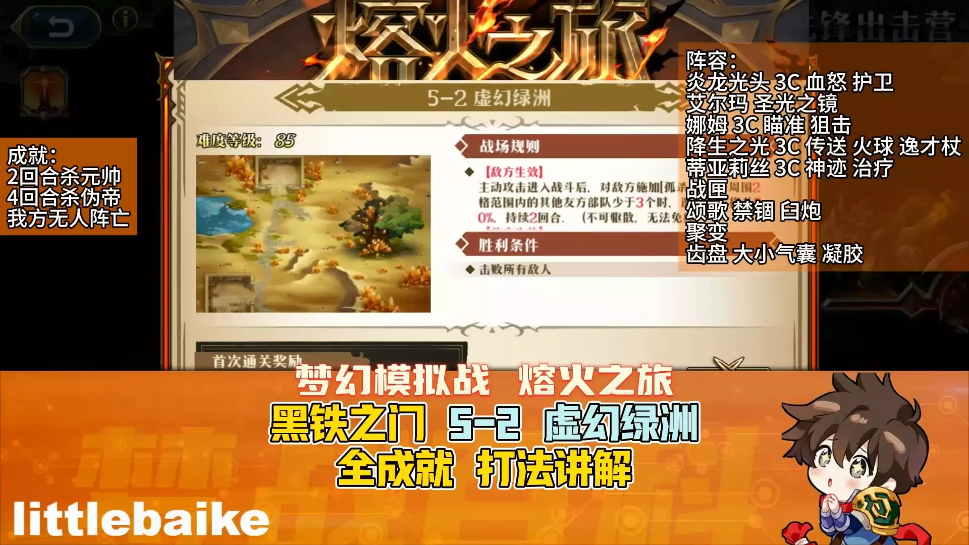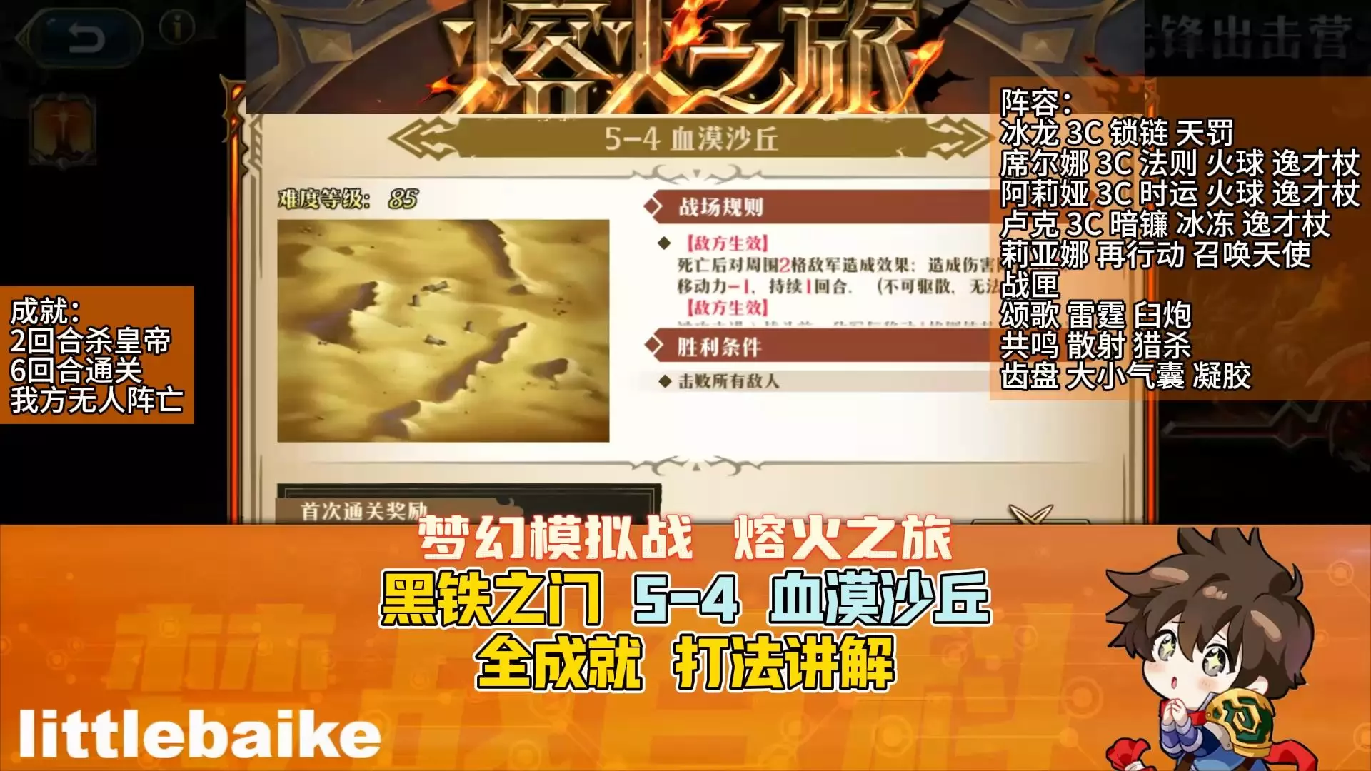这是《梦幻模拟战》熔火之旅黑铁之门5-1簇晶沙漠的全成就打法讲解,推荐了安德里奥、尤弥尔等阵容搭配,以及对应战匣组件,可达成2回合杀4人、4回合通关且我方无人阵亡的成就。