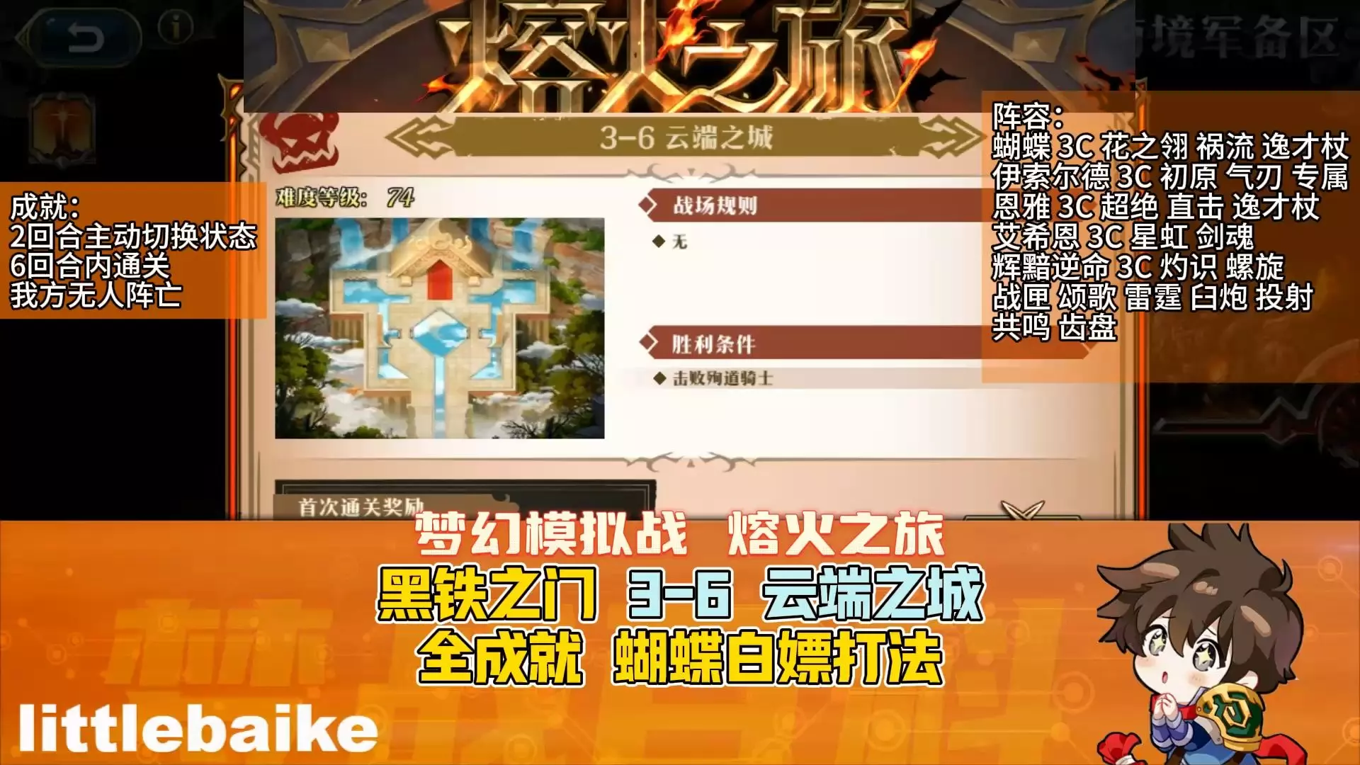阵容: 蝴蝶 3C 花之翎 祸流 逸才杖 伊索尔德 3C 初原 气刃 专属 恩雅 3C 超绝 直击 逸才杖 艾希恩 3C 星虹 剑魂 辉黯逆命 3C 灼识 螺旋…