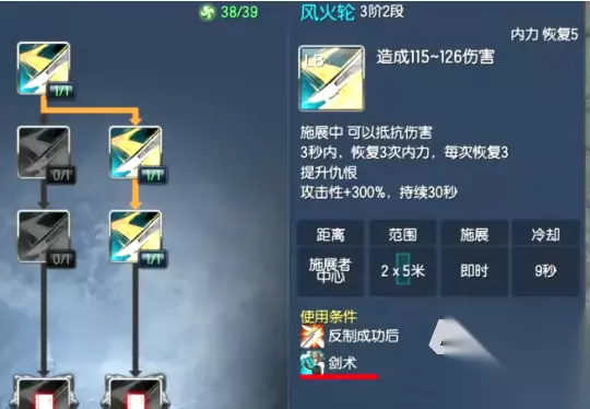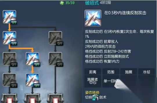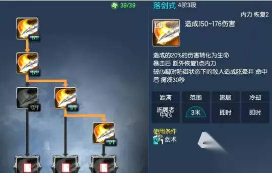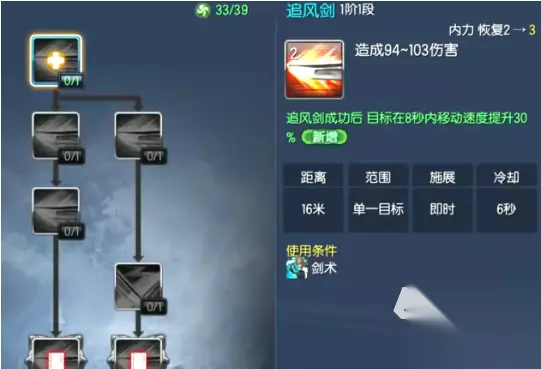推荐加点”落剑式”,需要在剑术姿态才能运用,其实就是平A,每次命中的情况下,能恢复2点的内力,打出暴击还能额外回复1点。buff类的技能还推荐”追风剑”,一个突进能力,命中有3点内力回复,并且带来30%移速加成,切换姿态转为疾风剑。