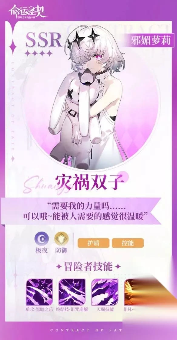 二、灾祸双子 技能介绍 1、常规技能:单攻·黑暗之爪、终结技·诅咒崩解、天赋技能、非凡觉醒 2、终结技(诅咒崩解): 对前方列目标造成物理伤害和眩晕效果,并为我方前排队友施加护盾。