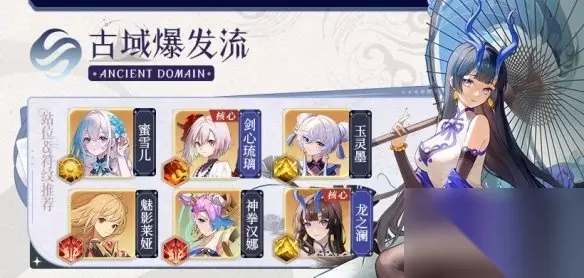 阵容推荐 古域爆发流 1、阵容组成:蜜雪儿、剑心琉璃、玉灵墨、龙之澜、神拳汉娜、魅影莱娅 2、玩法思路:这套阵容龙之澜在团队中担当着关键角色,她不仅为队友带来了源源不断的能量补充,同时也能显著削弱敌人的能量水平。